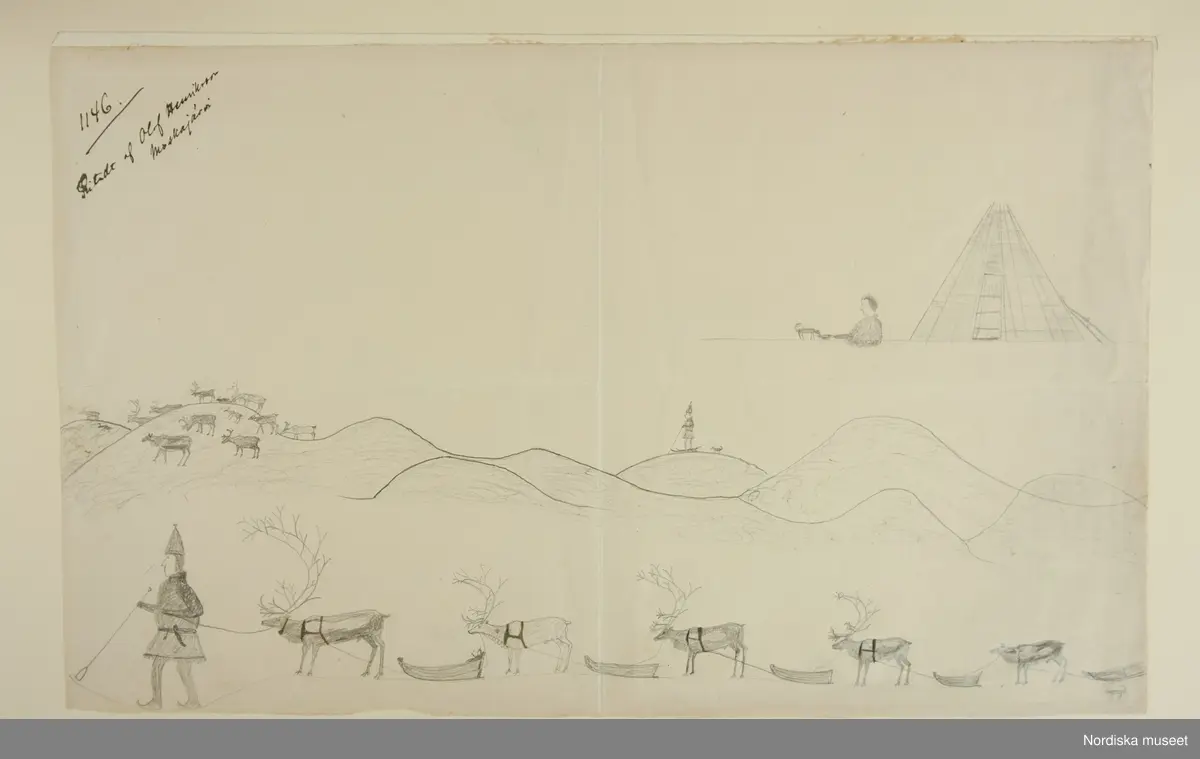 Teckning av Olof Henriksson, Moskajärvi. Man sittande utanför en kåta, renar på fjället och renspann som drar ackjor / pulkor. L.A. 3