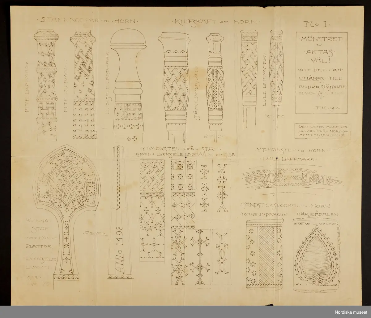 Mönsterteckningar av föremål tillverkade i horn. "De flesta modeller äro från Nordiska museets samlingar." Signerad: F.H. 1910. L.A. 712