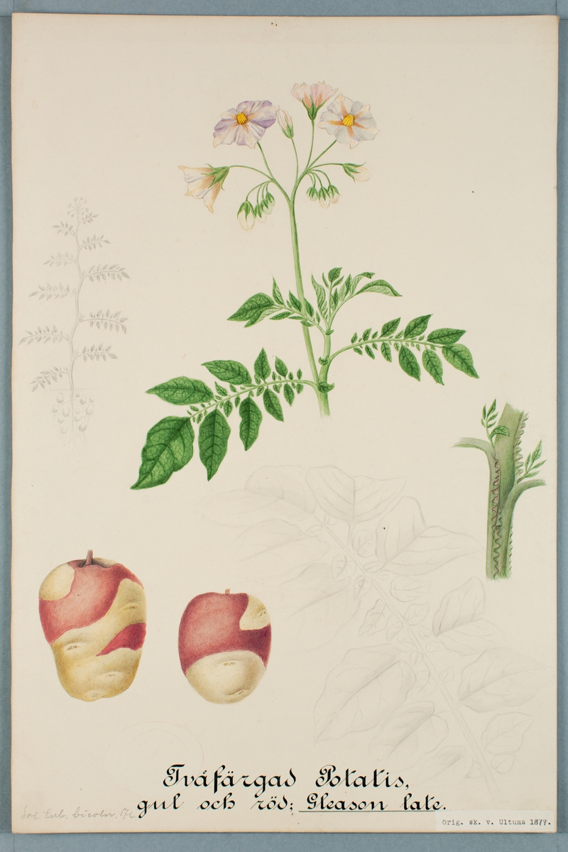 Sveriges kulturväxter. Illustration utförd av Henriette Sjöberg. Potatis, gul och röd, Gleason late. Odlad Ultuna 1877. Inv. nr. C101 : 347.