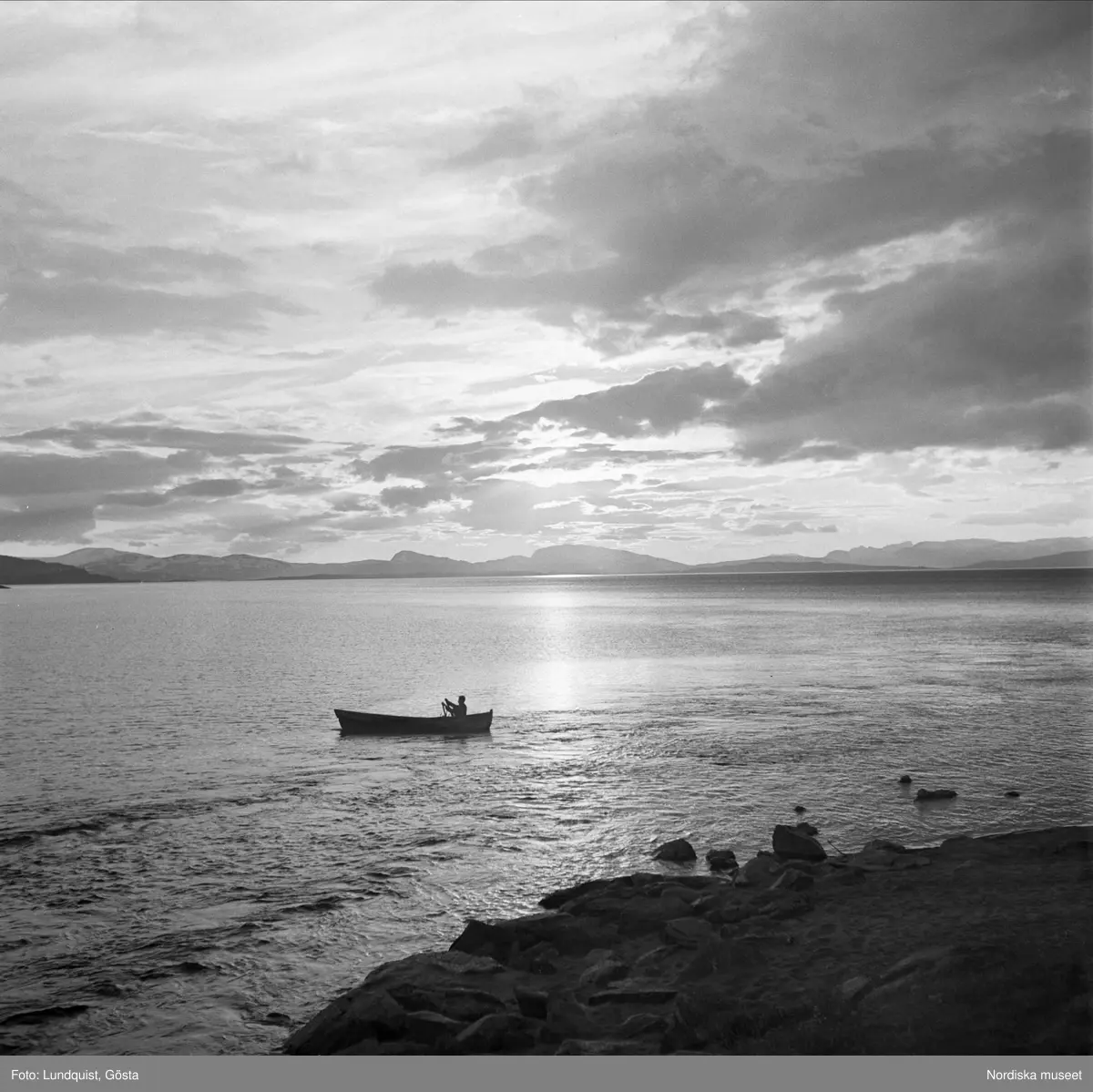 Dag Hammarskjöld på fjällvandring på Sulitelma. Vy över vattnet, med fjällen i bakgrunden. En man ror en båt.