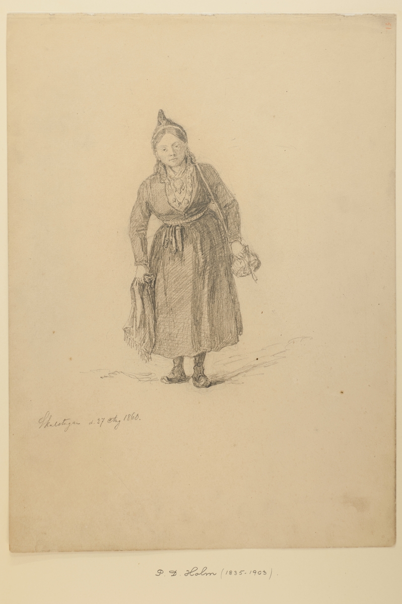 Teckning. Påskrift: "Skalstugan d. 27 Aug 1860. P. D. Holm (1835 - 1903)." Blyertsporträtt av en samisk kvinna.
