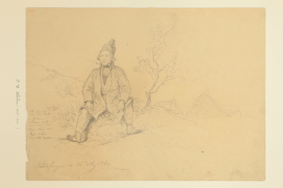 Teckning. Påskrift: "(?) d. 26 Aug 1860. P. D. Holm (1835 - 1903)" Man sitter och röker ute i naturen, kåta i bakgrunden.