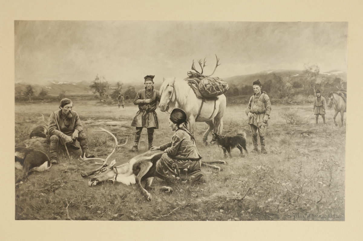 Samer som tillvaratar skjutna renar vid lägret vid Gleen. Oljemålning av Johan Tirén från 1891.