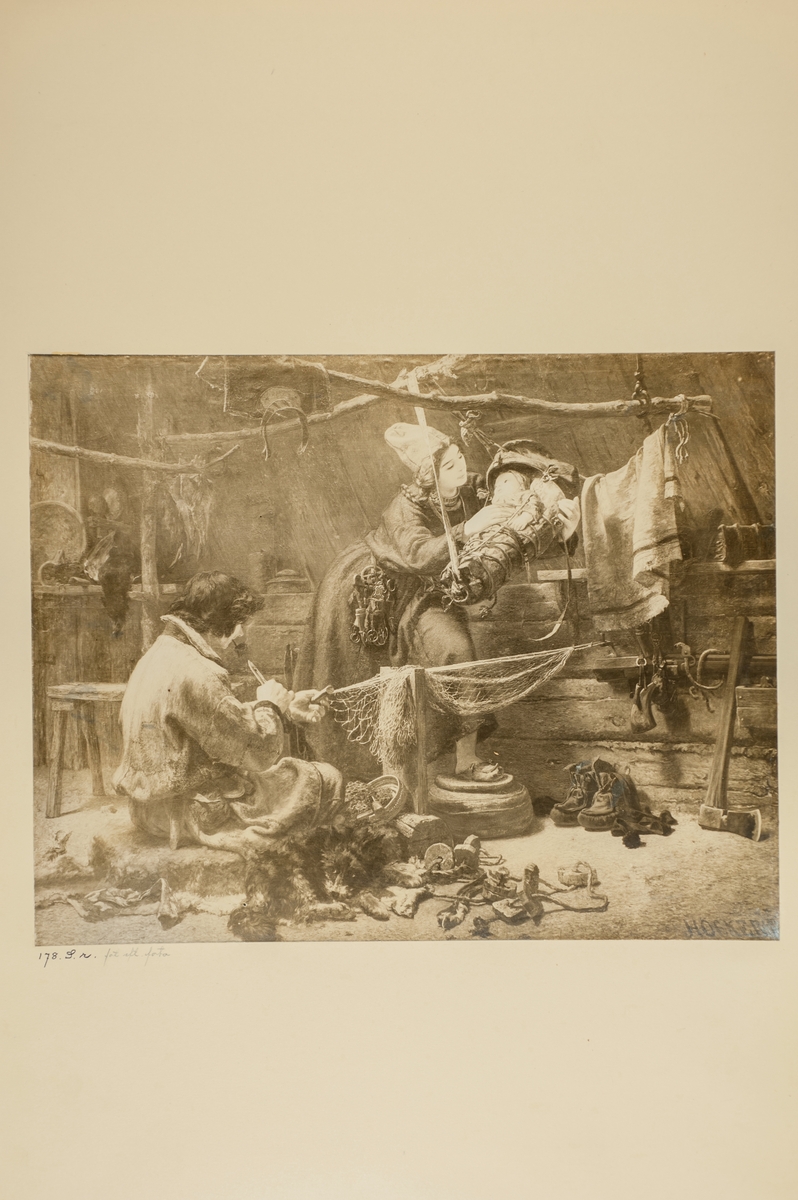 Samisk familj i sin kåta. Mannen lagar fiskenät, kvinnan vaggar ett litet barn. Tryck efter Johan Fredrik Höckerts oljemålning "Det inre av en kåta" från 1850.