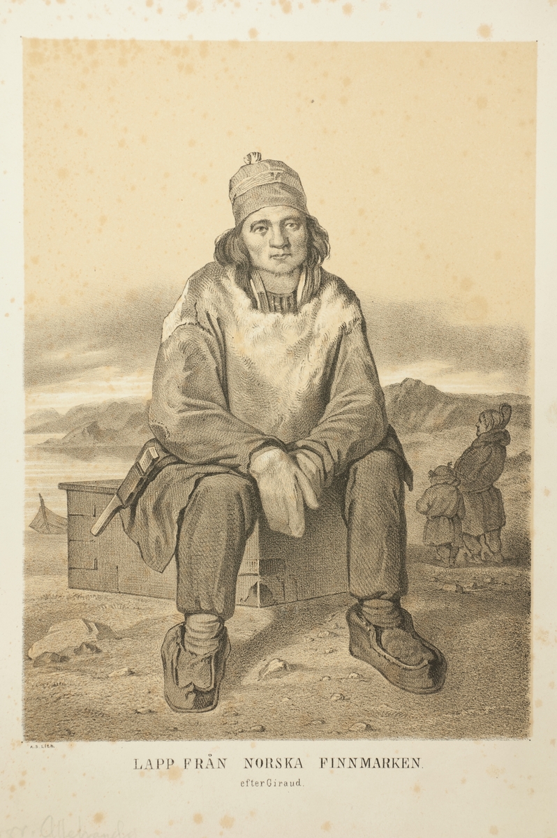 Grafiskt tryck. Same från Norska Finnmarken. Efter Giraud. Porträtt av ung man som sitter på låda.