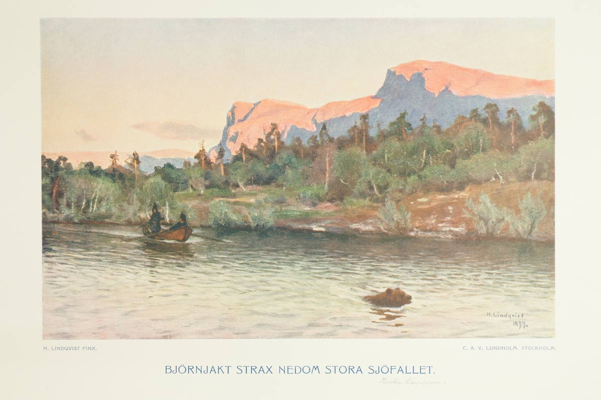 Färgtryck. Målning av Herman Lindqvist 1899. "Björnjakt strax nedom Stora Sjöfallet." Två män i en båt ror efter en simmande björn. Motivet är troligen publicerat i "Lappland : Det Stora Svenska Framtidslandet - En skildring i ord och bild af dess natur och folk", 1904,