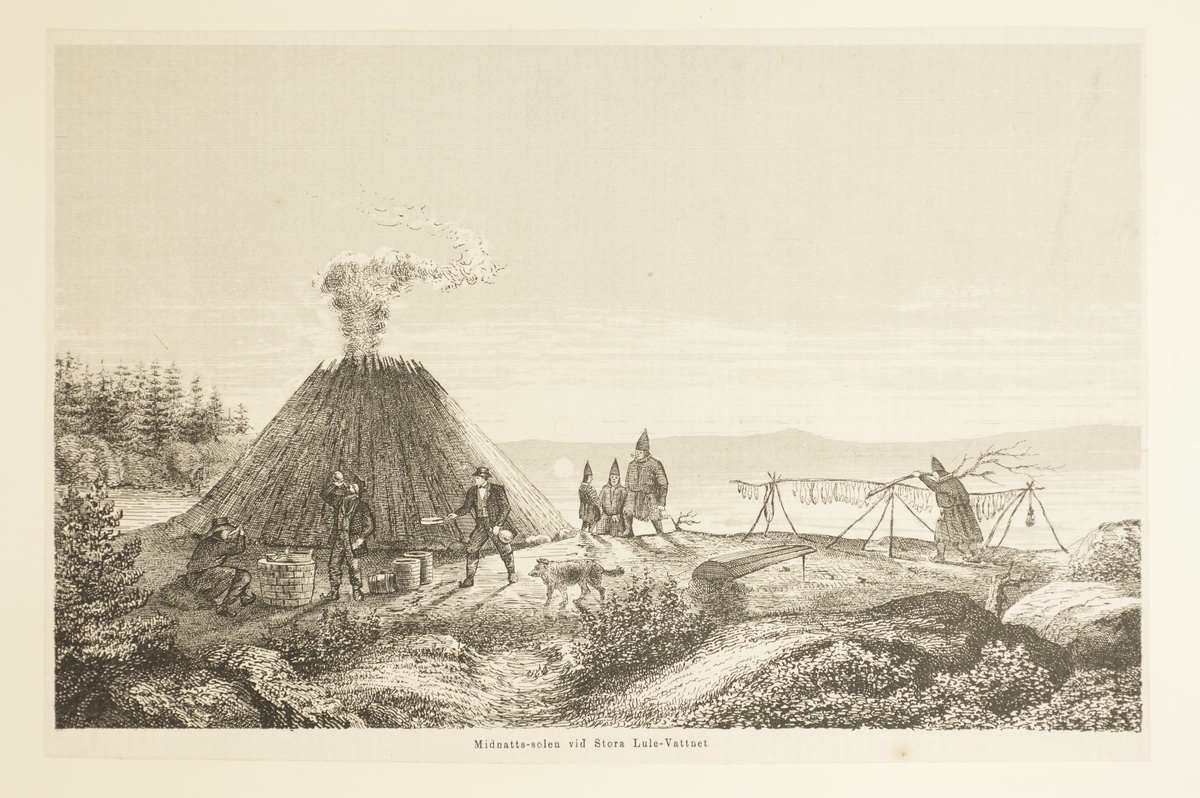 Grafiskt tryck. "Midnatts-solen vid Stora Lule-Vattnet." Människor framför en kåta, några delar en måltid.