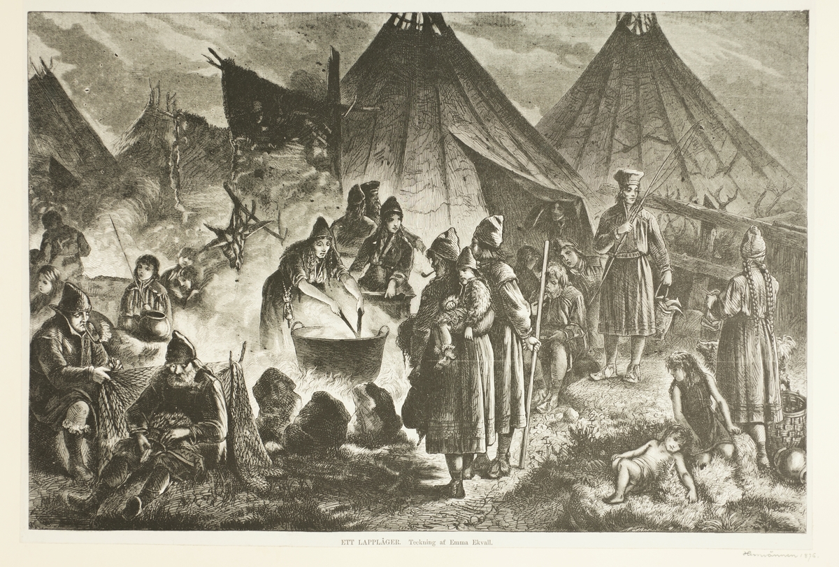 Grafiskt tryck, efter en teckning av Emma Ekvall. Människor i ett läger, samlade kring en kittel som värms på en eld. Möjligen publicerad i tidningen Hemvännen 1876.