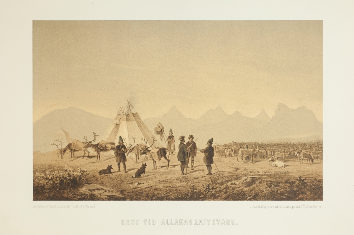 Grafiskt tryck. Motivet "Rast vid Allakaskaitevare" är hämtat ur planschverket Lappland, dess natur och folk av Carl Anton Pettersson 1866. Män framför en kåta, renhjord och fjäll i bakgrunden. L.A. 1044. Jämför NMA.0103168.