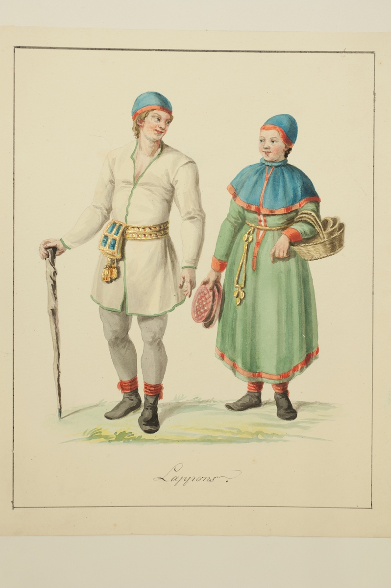 Akvarell, troligen utförd av Carl Wilhelm Svedman (1762-1840), möjligen för verket Costume of Sweden, 1822. "Lappons." Porträtt av en man och en kvinna.