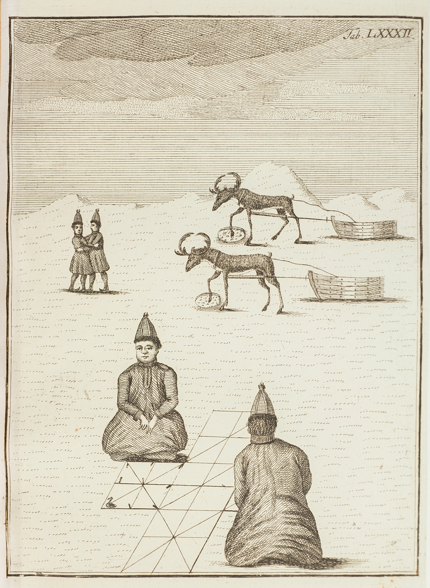Stick ur Knud Leems bok: Beskrivelse over Finmarkens lapper, deres tungemaal, levemaade og forrige afgudsdyrkelse med J.E. Gunneri Anmaerkninger. Tab. LXXXII. Två personer spelar ett spel "Kaase-Spil".