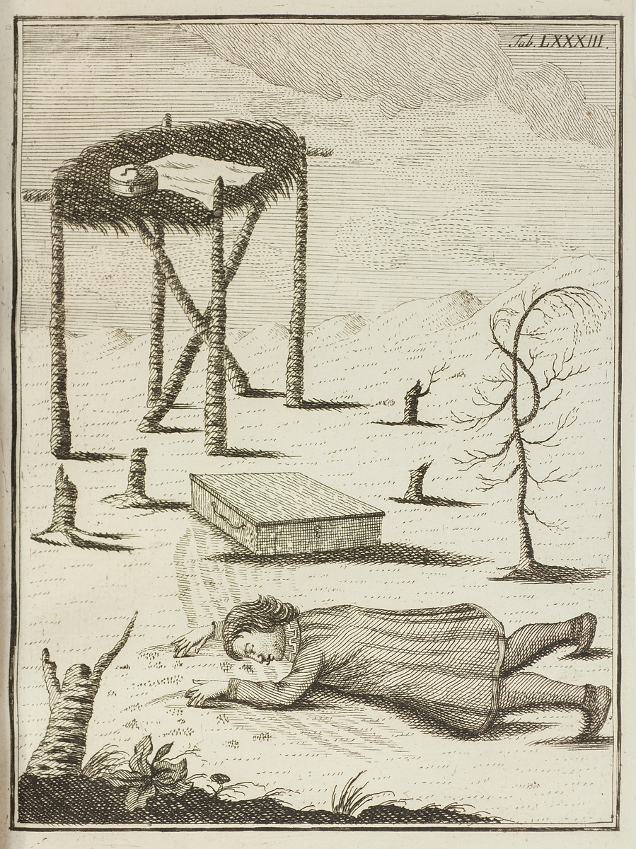Stick ur Knud Leems bok: Beskrivelse over Finmarkens lapper, deres tungemaal, levemaade og forrige afgudsdyrkelse med J.E. Gunneri Anmaerkninger. Tab. LXXXIII. En man - Juks Anodtsen - ligger platt på mage för att slicka upp utspillt brännvin.