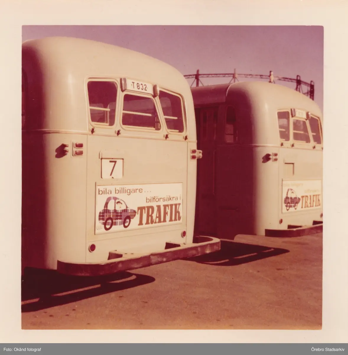 Två bussar med reklamslogan Bila billigare... bilförsäkra i TRAFIK. 1960-tal