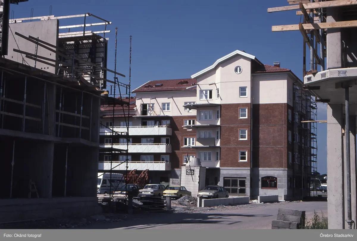 Flerbostadshus med byggställning i Ladugårdsängen, 1991