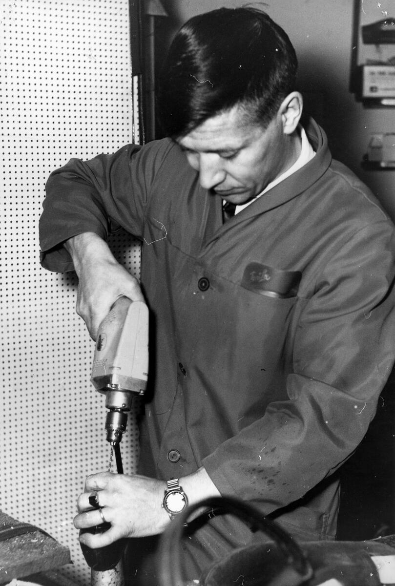Kjell Nylund på Nylunds skomakeri. Hål för klackning borras.