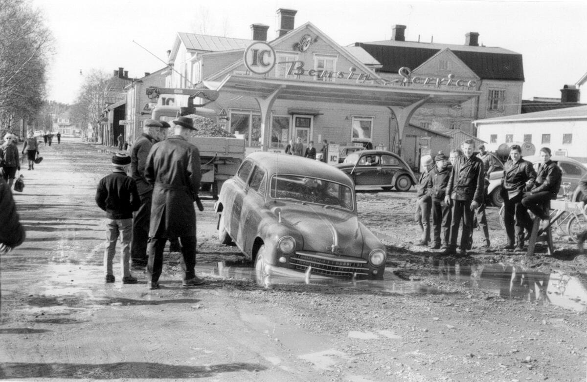 Bil som kört ner i vattenfylld grop med framhjulen.