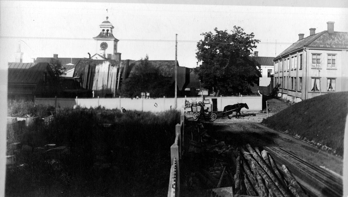 Stadsvy från kvarteret Rådhuset, mot kvarteret Telegrafen. Till vänster "Brända tomten"