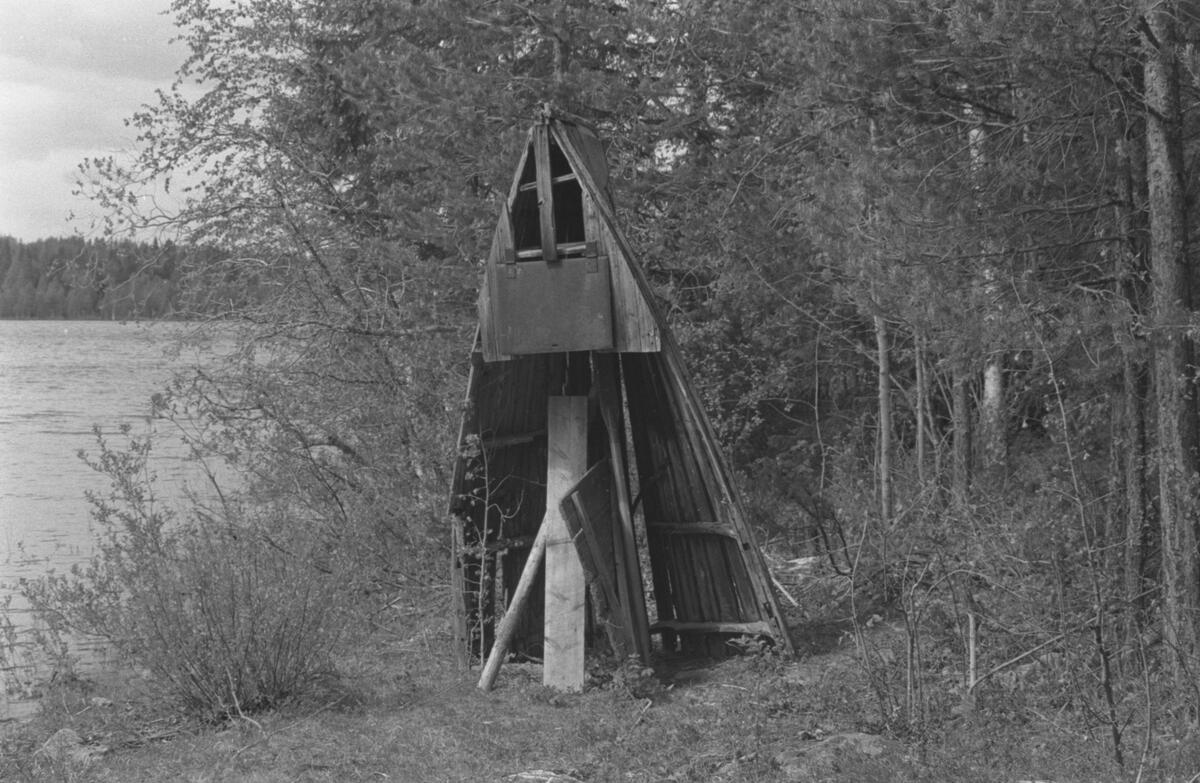 Halverad båt vid Ededammen. Uppställd som vindskydd. Gjordes på 1960-70-talet.