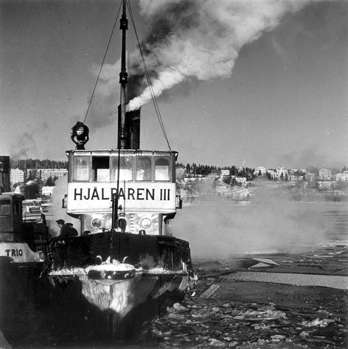 Fartyget Hjälparen III. Denna bild är sannolikt från Sundsvall, då både TRIO och HJÄLPAREN III hörde hemma där hos Elektriska Svetsnings- och Bogserings AB (J A E Jernberg)