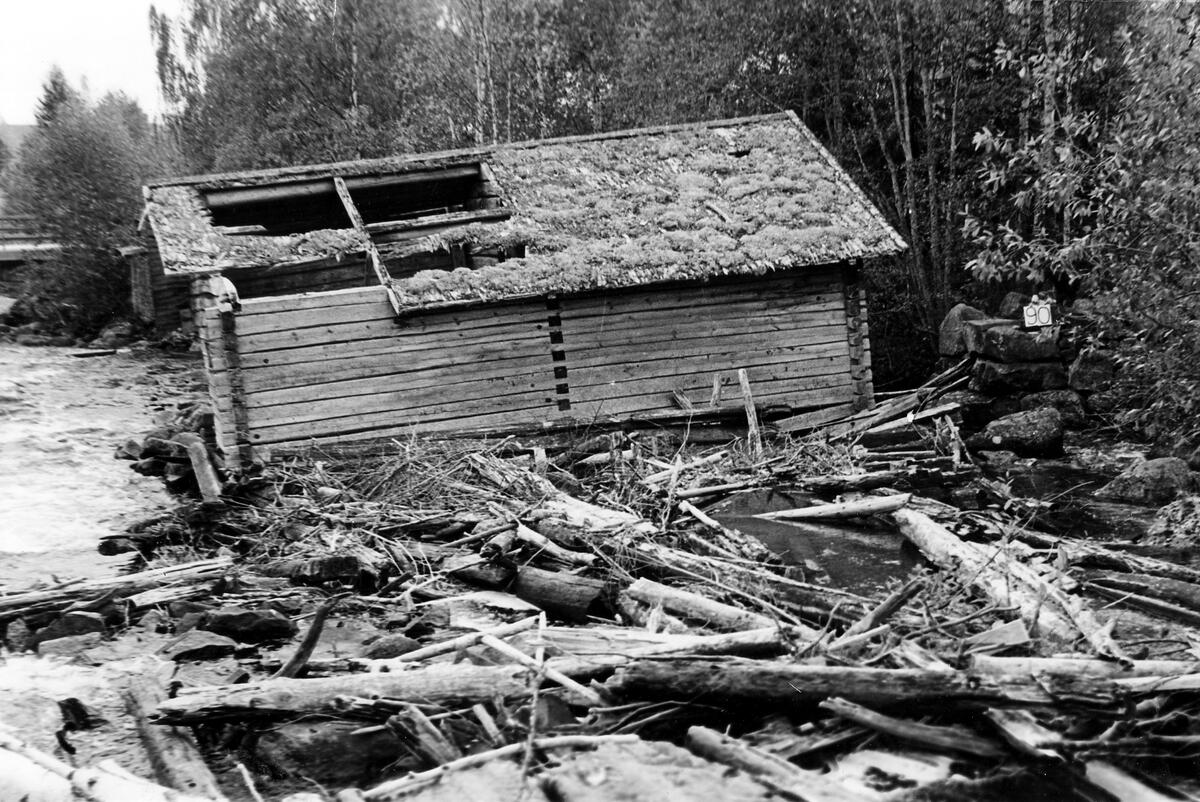 Kvarnen sedd från dammen. Rester av den rivna flottningsrännan skymtar i förgrunden. Rester av vattensumpen ses i förgrunden till höger. Landsvägsbron nedströms skymtar i bakgrunden till vänster Foto N.E. Nilsson, fiskerikonsulent..