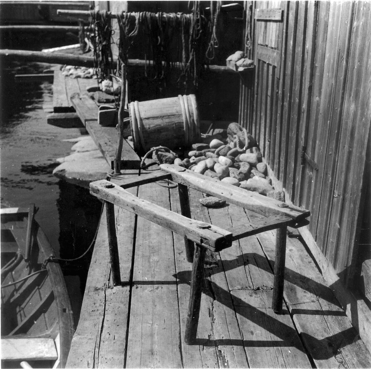 Ulvö. Marviksgrunnan. Bänk för gältråg. Skötstenar på bryggan. På stången hänger linor att förankra fiskeredskap med. På ställningen längst fram, ställdes gältråget, som fylldes med strömming när den skulle gälas.