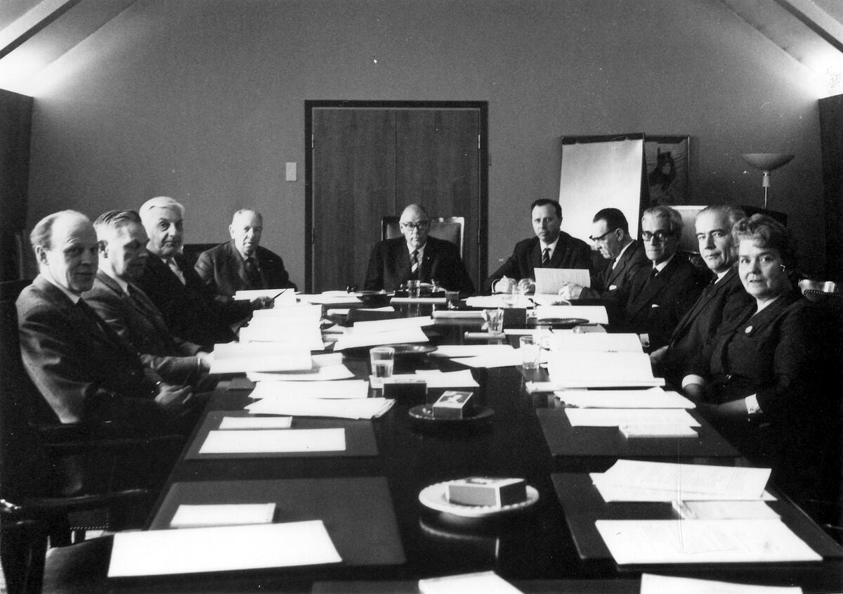 Landstingets förvaltningsutskott våren 1962. Från vänster direktör Jan Velander, Skönsberg, skogsfaktor Elias Jonsson, Ljustorp, f. fjärdingsman Ferdinand Lindkvist, Husum, lantbrukare Hilding Mikaelsson, Fränsta, kommunalkamrer Erik Olsson, Timrå (ordf.) landstingsdirektör Bengt Olsson, Härnösand, kommunalsordf. Martin Sörlin, Ramsele, riksdagsman Harald Kärrlander, Sollefeteå, ombudsman Otto Stadling, Fränsta och fru Edit Malmberg, Stockviksverken.