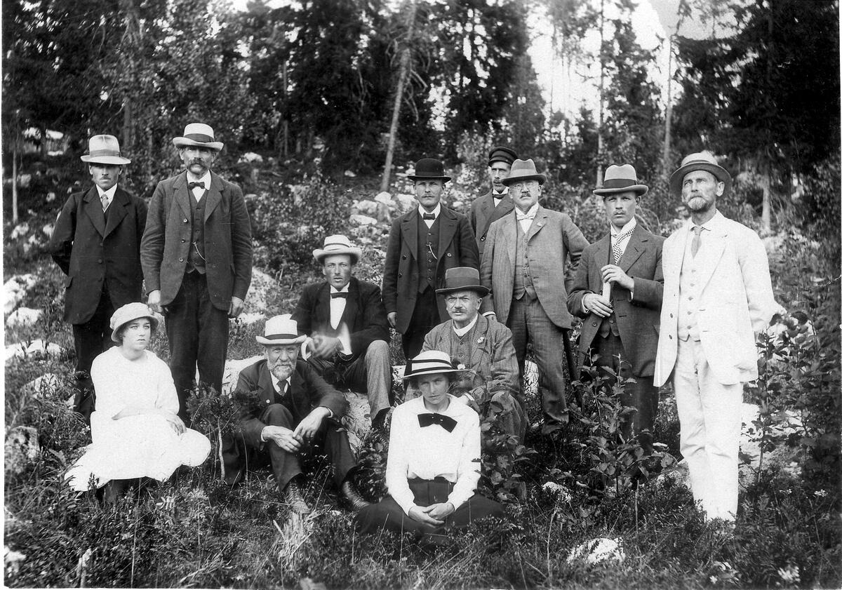 Folkmusiksammankomst. Sittande längst till höger K.P.Leffler, stående omedelbart till höger om leffler teckningslärare Gunnar Mankell. Till höger om lektor Torsten Bucht (med pappesrulle i handen).