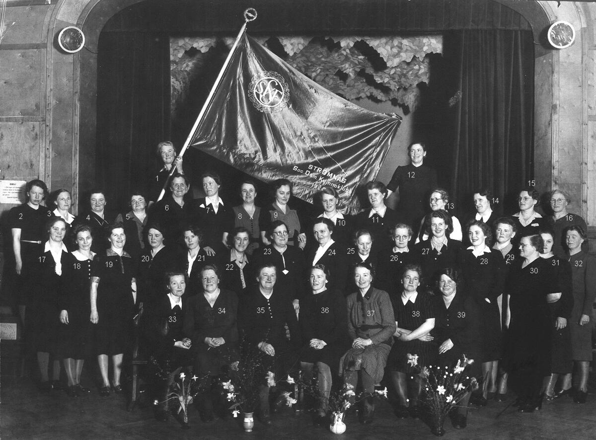 Ordenshus. Strömnäs Socialdemokratiska kvinnoklubben. 1.Selma Eriksson, 2. Ines Östaman, 3. Greta Karlsson, 4. Dagny Lundqvist; 5. Anna Fahlén, 6. Hildur Wiklund, 7. Tynis Jonsson, 8. Alma Olsson,; 9. Anna Öberg, 10. Henny Hedström, 11. Astrid Olsson, 12. Anna Sjölund; 13. Albertina Nilsson, 14 Gunhild Öberg, 15. Svea Näslund, 16. Signe Nyberg, 17. Gerda Dylin, 18. Lydia Lind, 19. Hedda Sjölund, 20. Hanna Lundin, 21. Gerda Nordlöv, 22. Hilda Sundin, 23. Helga Nilsson, 24 Tina Tjärnlund, 25. Elma Hessel, 26 Siri Holmström, 27. Greta Sjödin, 28. Sina Olsson, 29. Dagmar Höglund, 30. Ada Nordlander, 31. Viola Gidlund(gift; Bylund) 32. Emmy Wigren, 33. Göta Byström, 34. Jenny Sundlöv, 35. Lina Frölander, 36. Judith Sjödin, 37. Rut Andersson, 38. Karin Höglin,; 39. Maja Ramström