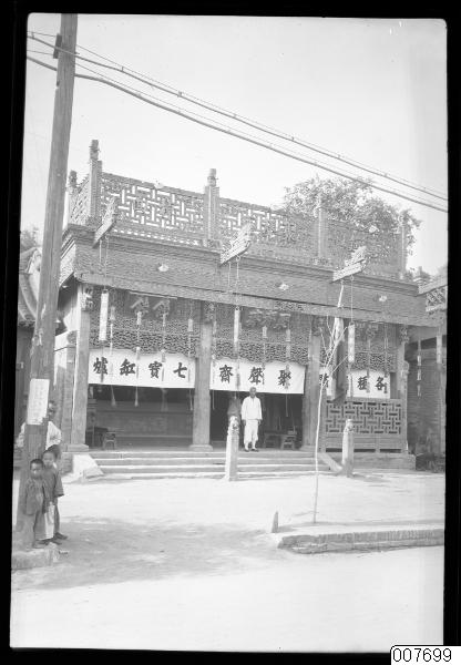 Gata med en affär. Några vuxna och barn poserar nyfiket för kameran.