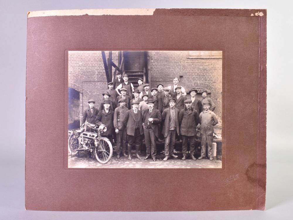 Svartvitt fotografi klistrat på brun papp. Fotografiet föreställer ett grupporträtt av fabriks- och industriarbetare. Gruppen består av unga och vuxna män. Gruppen står framför en tegelbyggnad, några av männen står på en trappa. Mannen längst till vänster i bild står med en motorcykel. Troligen är bilden tagen utanför Ernst O. Jönssons cykelfabrik (Cykelfabriken Kärnan).