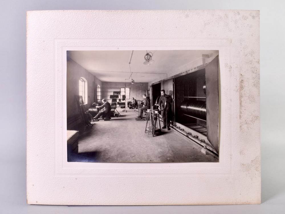 Svartvitt fotografi limmat på vit papp. Fotografiet föreställer Cykelfabriken Kärnans verkstad. På bilden ses män arbeta med tillverkning av cykelhjul. Männen bär arbetsklädsel. I taket hänger lampor.
