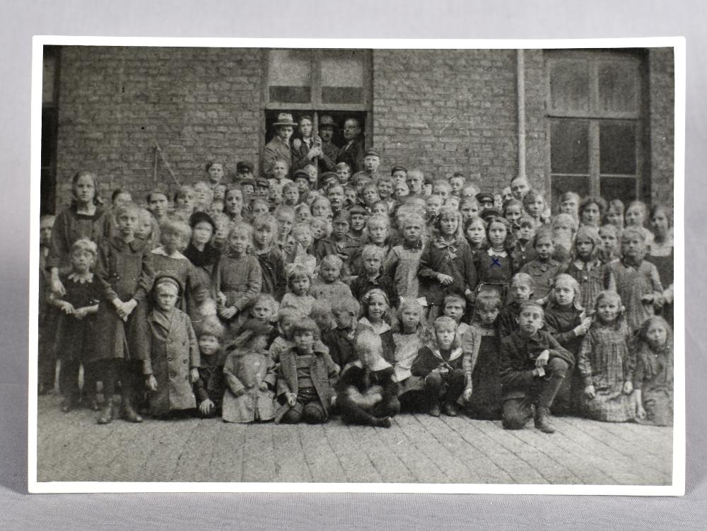 Svartvitt fotografi, grupporträtt av en skolklass i Helsingborg. På bildens syns både flickor och pojkar, ståendes och sittandes i rader mot en tegelvägg. I ett av fönsterna står fyra män, troligen lärare. Till höger i bild ses en leendes flicka markerad med ett kryss på bröstet, detta är Dagny Håkansson f. Blom (f. 1909).