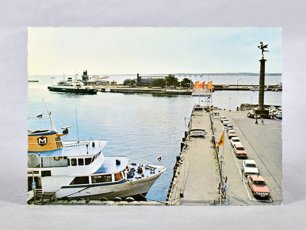 Färgfotografi/vykort med vy över Helsingborgs hamn ut mot Parapeten och sundet. Bilden är tagen från Hamntoget, troligen mellan 1960--1980-tal. Till höger ses flertalet bilar stå parkerade bredvid "Sjöfartsgudinnan" av Carl Milles. På baksidan finns plats för att skriva.