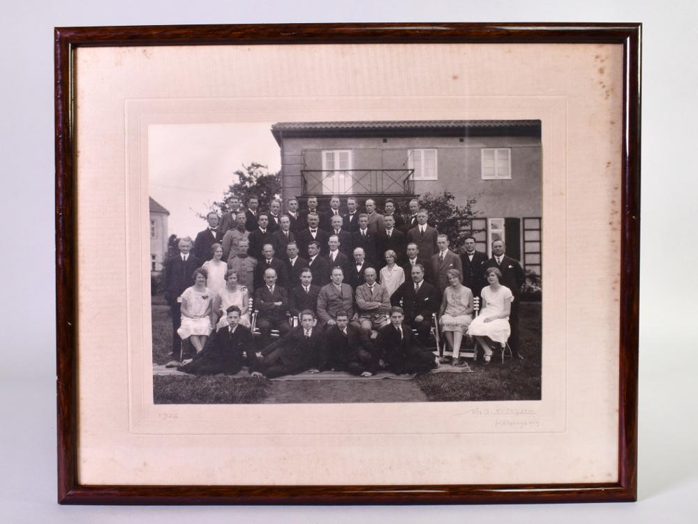 Svartvitt fotografi, inramat med glasskiva och brunlackerad träram. Fotografiet är ett grupporträtt av ett finklätt sällskap bestående av både män och kvinnor. Sällskapet är placerade framför en bostad. Männen bär kostym eller uniform, kvinnorna bär ljusa klänningar. Tredje person från höger, ståendes på den mellersta raden, är Gustav Larsson. Gustav arbetade för Cykelfabriken Kärnan i helsingborg. Fotografiet är taget av Nils A. Srichsen och inramat av Björkmans glasmästeri AB. På baksidan löper en tunn metalltråd sida till sida för upphängning