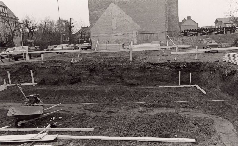 Bilden som är intagen mot öster visar en byggnadsplats, ett schakt för husgrunder på Långvinkeln V 49, år 1971. På bilden syns olika typer av byggandsutrustning (t.ex. skottkärra, träplankor, trästaket, en motordriven maskin, mm). I bakgrunden syns en del av ett bostadsområde, gatubelysningar och flera bilar.