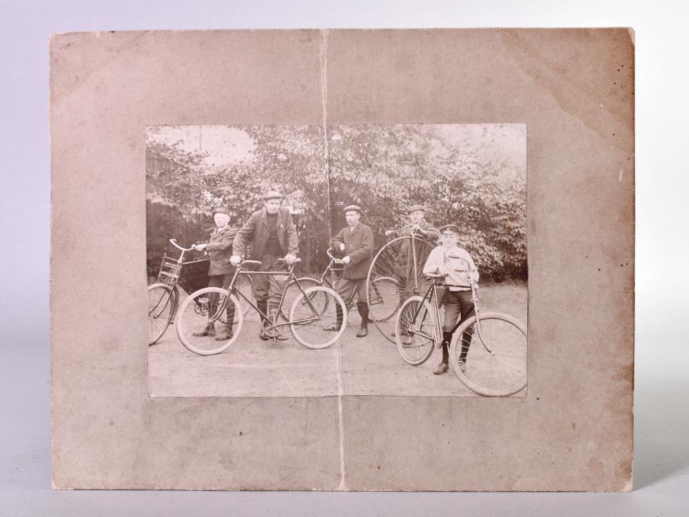 Svartvitt fotografi limmat på grå pappskiva. Fotografiet föreställer en samling unga män/pojkar som står med varsin cykel. Cyklarna är av olika modell. De bär alla mössa och vardagskläder. Bakom dem syns ett buskage.