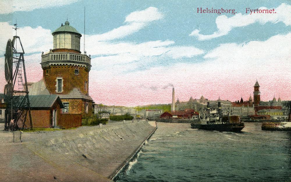 Vykort i papper. På framsidan ett svartvitt fotografi som sedan är handkolorerat. Vy över inloppet av Helsingborgs hamn med "Lilla färjan" och Fyrhuset (även kalla Lotshuset) rakt fram. På vykortens baksida finns plats för att skriva.