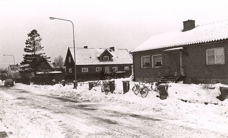 Bilden visar en vintertablå med flera bostäder på Godemansgatan, år 1971. På bilden syns två överlämnade cyklar framför ingången till ett bostadshus, flera gatubelysningar och i bakgrunden en bil.