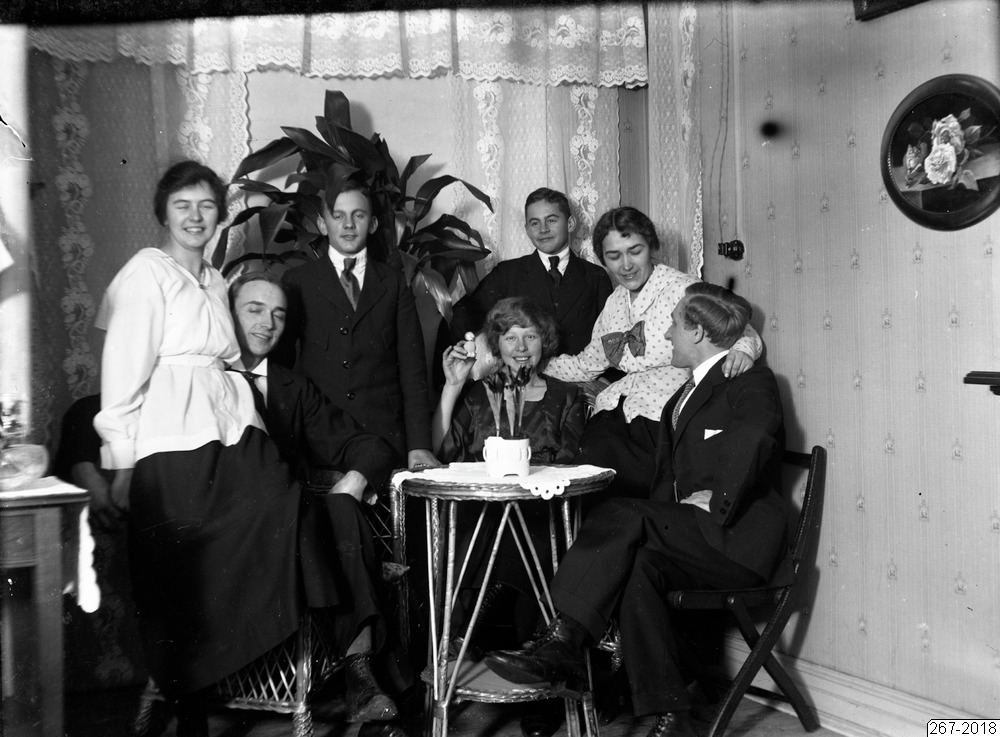 Bilden föreställer sju personer sittandes och ståendes i en hörna av ett rum samlade runt ett bord. Fönster med gardin och växt i bakgrunden. På bordet står en kruka med någon växt.