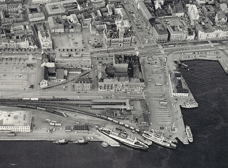 Flygbild över Helsingborg med rådhuset, järnvägen, hamnen och färjestationen. På fotot står skrivet med tusch: "Onsdag 2 juni kl ---".