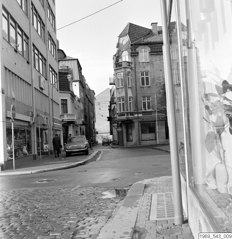 Bilden föreställer en stadsmiljö. I bildens mitt är Norra Strandgatan med en parkerad Ford Taunus. Till vänster är baksidan av HD-huset i kvarteret Färjan, till höger hörnet av ett flerbostadshus i kvarteret Delfinen.