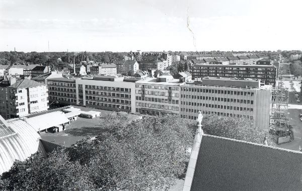 svartvitt fotografi föreställande utsikt från Gustav Adolfskyrkan, kvarter Danmark m.fl., Södergatan. År 1970.
