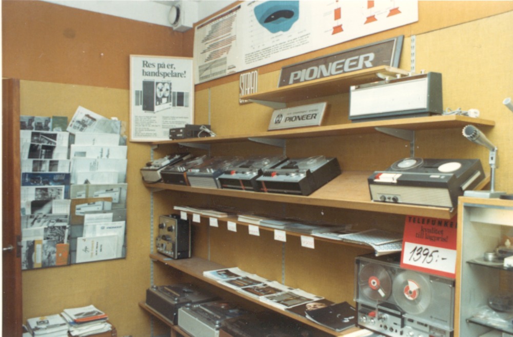 Beskrivning: Färgfotografi från 1970-tal som troligen avbildar insidan av Hefomas affär på Stortorget 16. Här ett rum med elektronik som bandspelare, högtalare, mikrofoner.