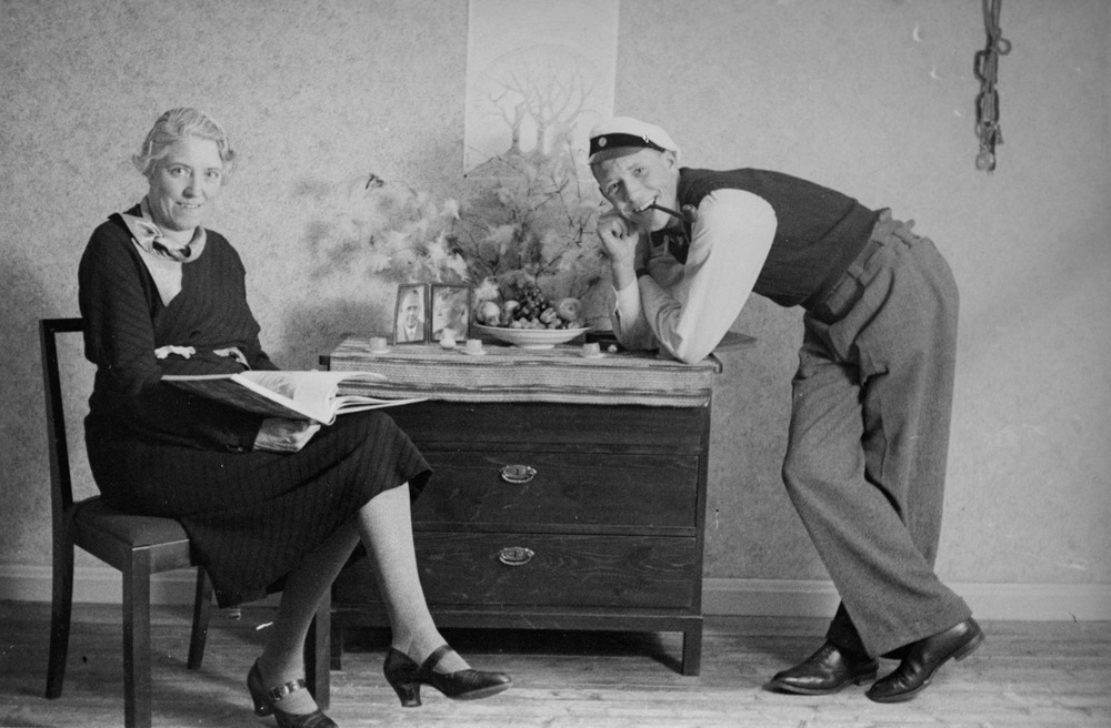 Porträtt av Jenny Tanner med sonen Eric Tanner som är iklädd studentmössa och röker pipa. Bilden troligen tagen på Finlands självständighetsdag.