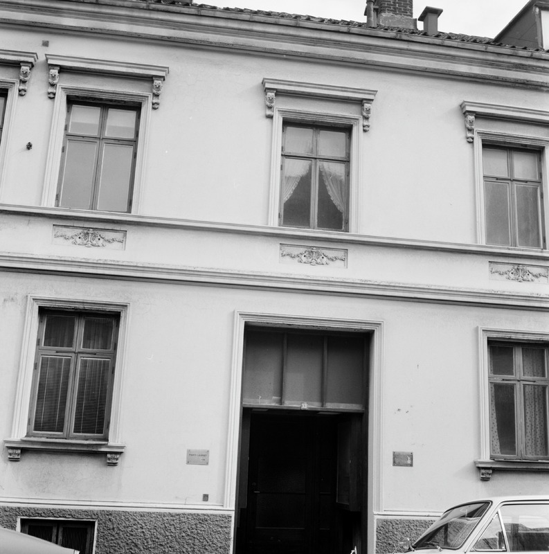 Bilden föreställer en del av en husfasad på ett tvåvånigshus. Port i mitten.