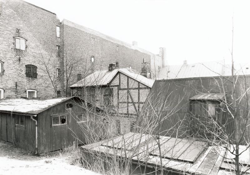 Bild över gårdsinteriören på Södra Storgatan 33. På bilden syns taken till flera tillbyggnader samt en hög murad fasadvägg till vänster. Väggen har fönster i olika storlekar. I mitten syns ett gårdshus med en murad fasad med inslag av korsvirke.
