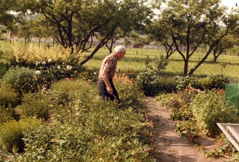 Fotografi av Knut Svensson vid sin egen täppa i fruktträdgården.