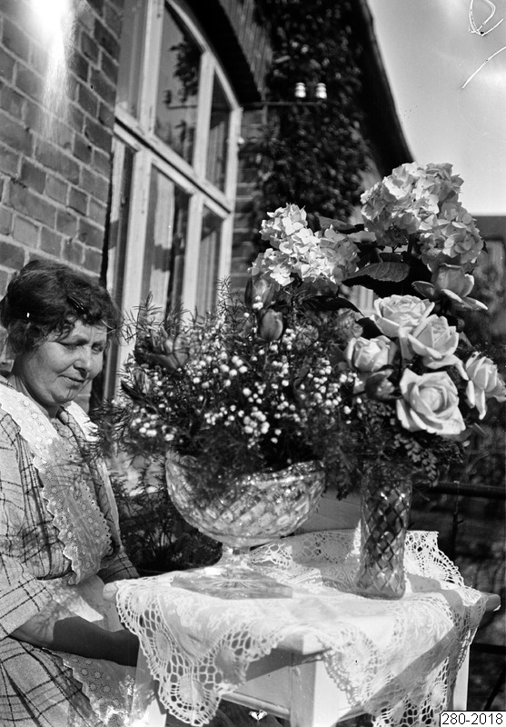 Bilden föreställer en kvinna sittande i en trädgård vid en husfasad. Framför kvinnan ett litet bord med duk på. Där står också två blomvaser fyllda med blommor. Till höger i bakgrunden trädgård.