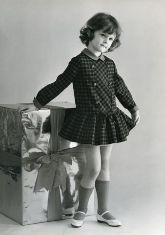Bild av en flicka, vid ett paket, i klänning från AB Margita konfektion i Helsingborg.