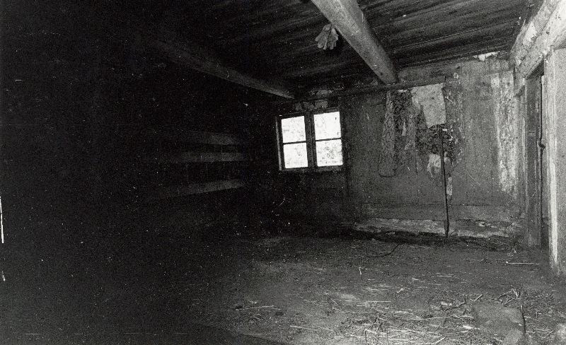 Bunkagården år 1971. Timrad stuga, interiör, norra väggen.